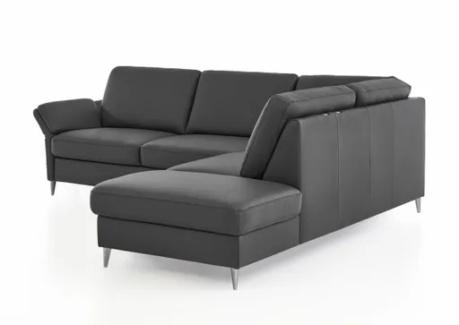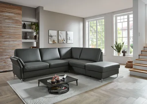 Das Ecksofa - 3-Sitzer mit Ecke rechts in elegantem Anthrazit bietet nicht nur einen modernen Look, sondern auch außergewöhnlichen Komfort. Mit einer Sitzhöhe von ca. 46 cm und einer Belastbarkeit von bis zu 120 kg ist es ideal für entspannte Stunden. Die Füße aus Aluminium sorgen für Stabilität und Langlebigkeit, während die Kombination aus Diolenwattenabdeckung, Kaltschaum und Stahlwellenfedern ein angenehmes Sitzen ermöglicht. Die Rückenlehne mit Gummigurten und Kaltschaum bietet zusätzlichen Halt und Komfort.
